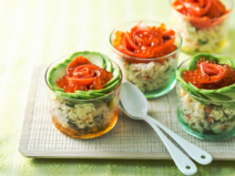 色とりどりの具材を重ねた、華やかな一品です。