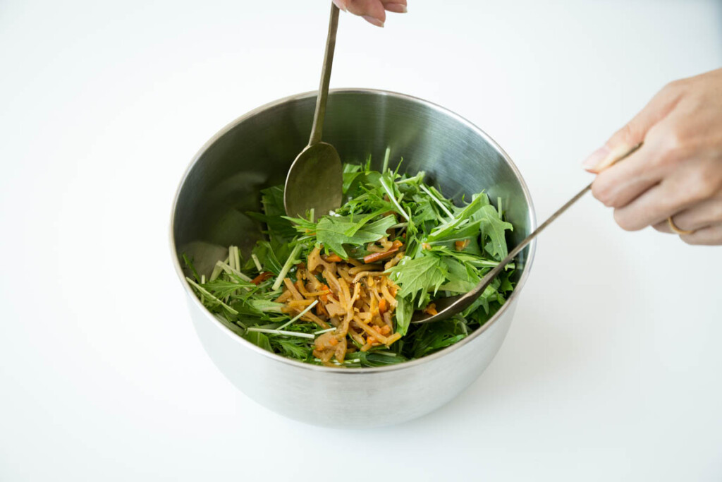 ポイントは先に水菜ときんぴらをよく和えること
