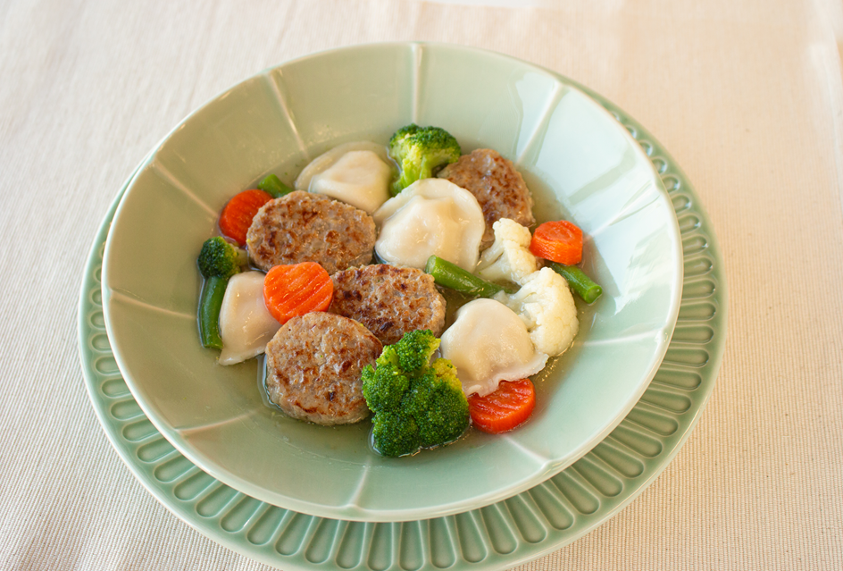 2025.10.27 夜食 おかず 汁物・スープ 鍋 ポトフ風具だくさんスープ 冷凍和野菜ミックス 冷凍ギョウザ 冷凍ハンバーグ 材料(2人分) 約5分 冷凍水餃子4個 冷凍ミニハンバーグ4個 冷凍洋風野菜ミックス70g 水60g チキンコンソメ小さじ1/2 オリーブオイル小さじ1 作り方 耐熱容器に、水とチキンコンソメを入れる。 冷凍水餃子、冷凍ミニハンバーグ、冷凍洋風野菜ミックスを加え、電子レンジで約4 分30 秒温める。 仕上げにオリーブオイルを回しかける。