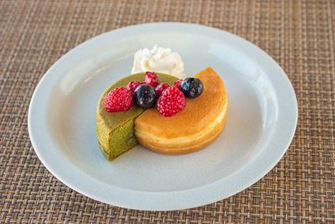 1の今川焼を2 等分に切り、カスタード味1/2個、抹茶味1/2 個をそれぞれお皿に盛りつける。