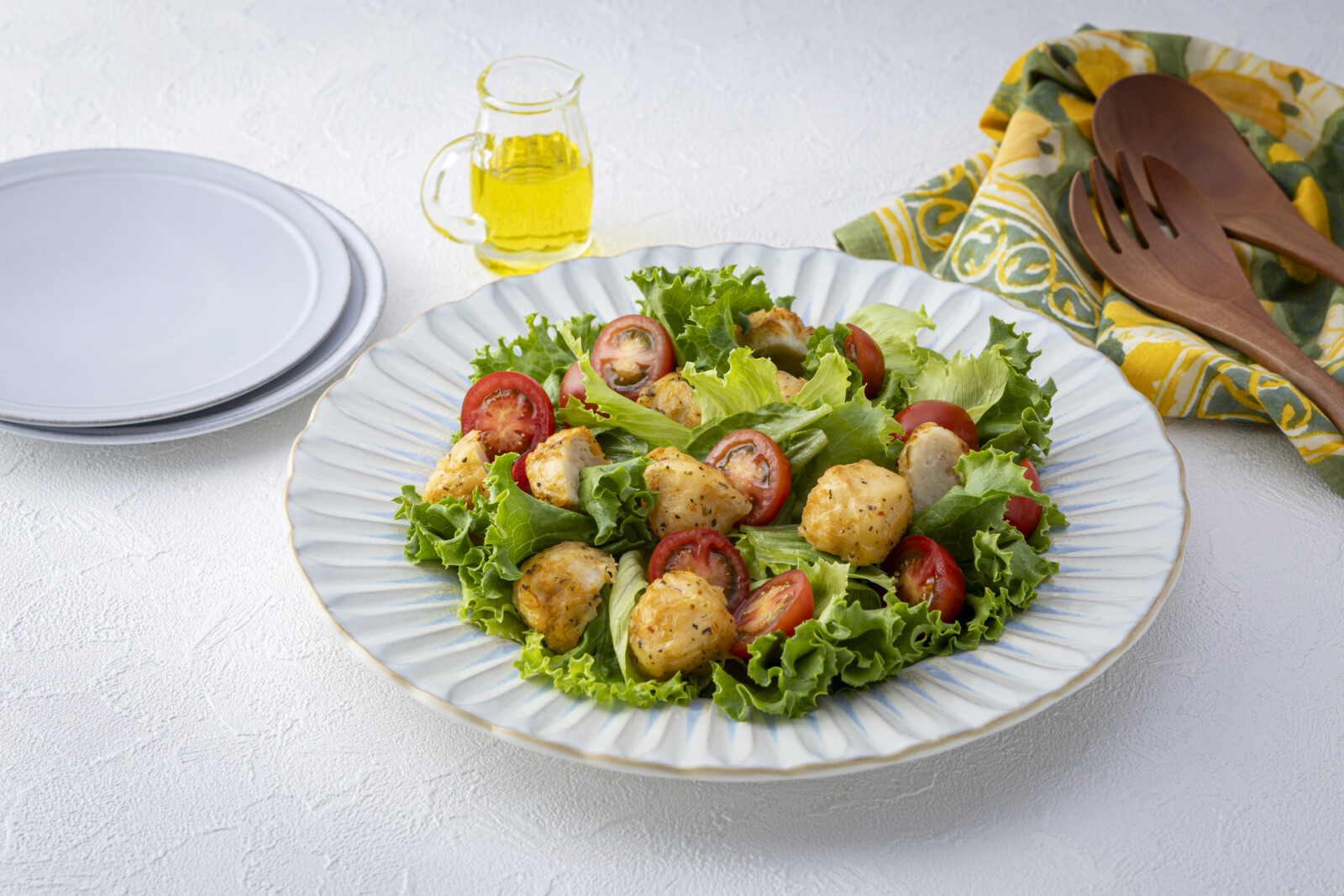 冷凍食品のから揚げはしっかり味がついているので、ドレッシングをかけなくても、レタスと一緒に美味しく食べられます。お好みでオリーブオイルをかけて、手軽なサラダが完成します♪