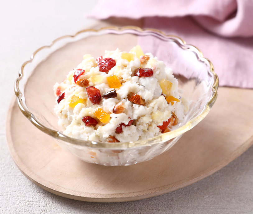 クリーミーな里芋のベースに、甘酸っぱいドライフルーツと食感のあるアーモンドがアクセントになります。