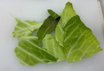 キャベツの葉1枚を6~8枚にちぎります。食べる時に切らなくてよいので、小さなお子様でも食べやすくなります。芯を指でつぶせない場合は、包丁でそぎ落として、鍋に加えます。