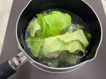 芯の部分は一番下に敷いておくと柔らかくなります。チーズがキャベツとシュウマイをくっつける役目をしてくれるとともに、スープにコクが出ます。