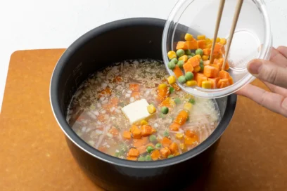 3に2とミックスベジタブル<A>の材料をいれて炊き上げる。
