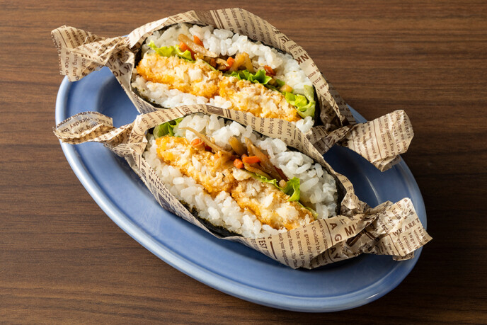 白身魚フライときんぴらのタルタルおにぎりサンド